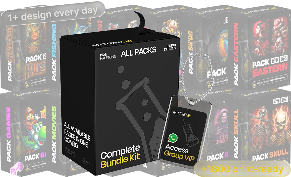 What surprised me the most about Halftone was the value for money. The amount of designs you get in the pack is crazy for the price they charge. You can create streetwear, casual or themed collections… all with professional quality. I’ve already used the designs for both DTF and sublimation and the final result always comes out sharp, without that blown-out or pixelated look. Today it’s one of the few products I recommend without hesitation.